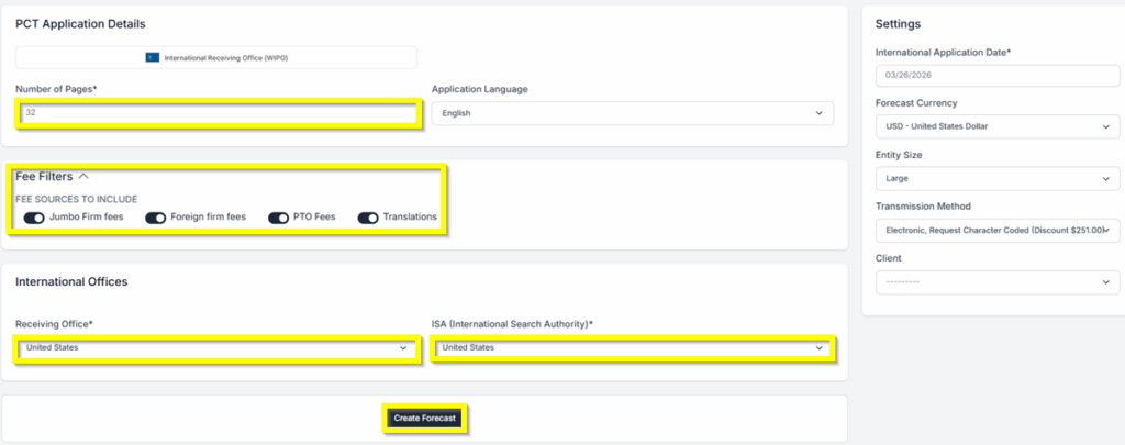 Let’s forecast the costs for a PCT Application and also add Direct National filings with it.